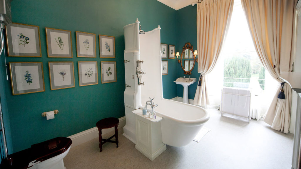 The Blue Room acquired its marvellous deep blue colour from Lady Leonie Leslie, before she later moved into the Mauve Room. Subsequently it was transformed to an ‘Odeon cinema’ style TV room, with suitably hideous colours and plastic seats, for Sammy Leslie and her little sister, Camilla. Upon it’s restoration as a guest room, Sammy faithfully reinstated and replicated the blue colour in the bedroom and also the bathroom, which was once a dressing room.